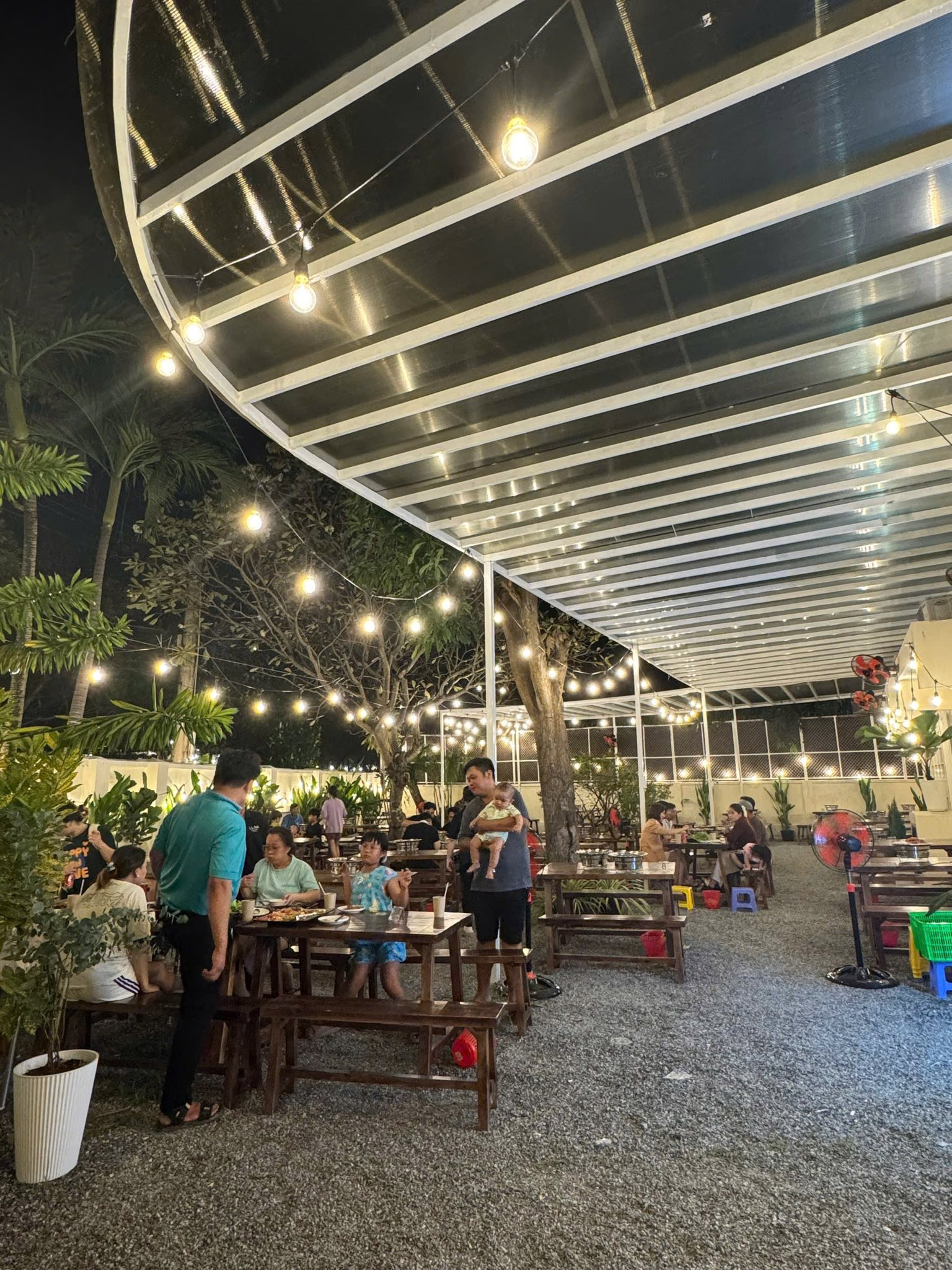 Một trong những lý do khiến Luna Garden ghi điểm mạnh là không gian ngoài trời rộng và thoáng, buổi tối lên đèn vàng nhìn khá chill, có cảm giác giống những quán nướng sân vườn ở Đà Lạt. Bàn ghế bố trí thoải mái, không bị sát nhau, đi nhóm đông vẫn dễ nói chuyện.