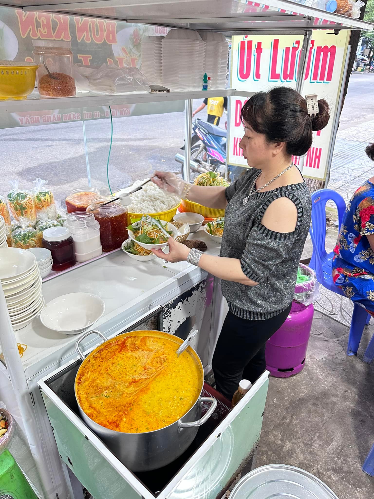 Người bán thường trụng bún cho nóng, cho gỏi đu đủ hoặc bắp chuối lên trên, thêm từng muỗng thịt cá đã xay nhuyễn, rồi chan nước kèn béo sền sệt. Khi trộn đều, bạn sẽ cảm nhận: