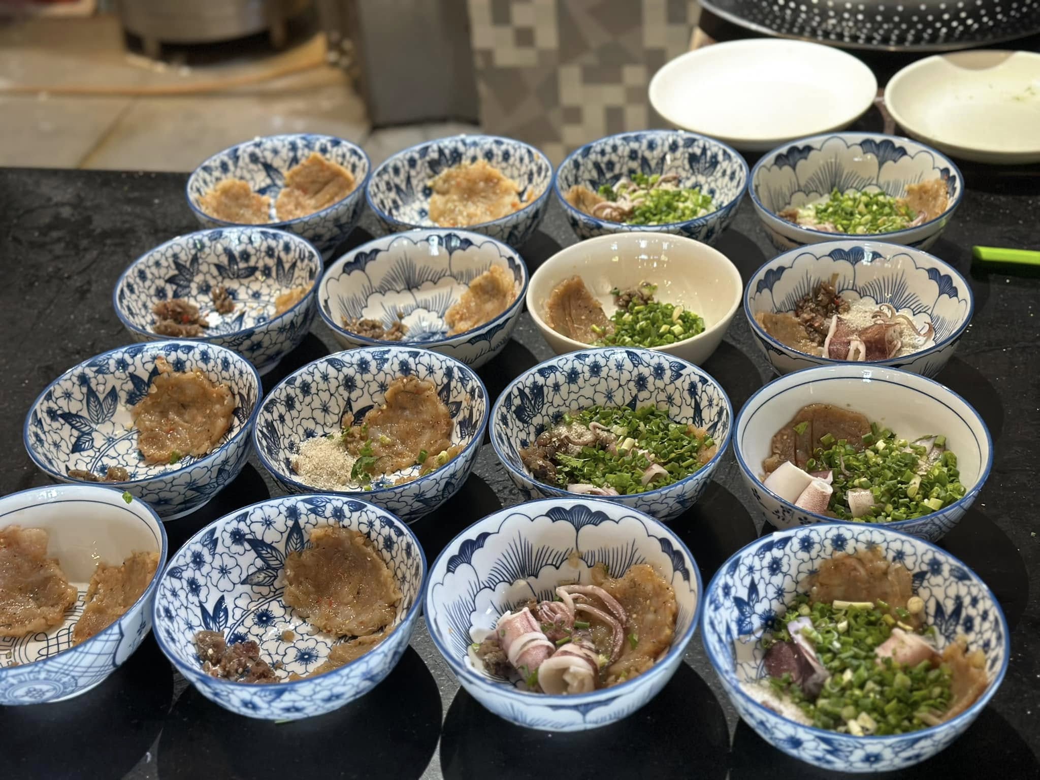 Tôm, cá, mực được xay nhuyễn, cho vào tô, thêm nước lèo nóng sôi rồi “quậy” mạnh tay để làm chín phần thịt, tạo thành lớp topping đặc sệt, thơm bùi đặc trưng.