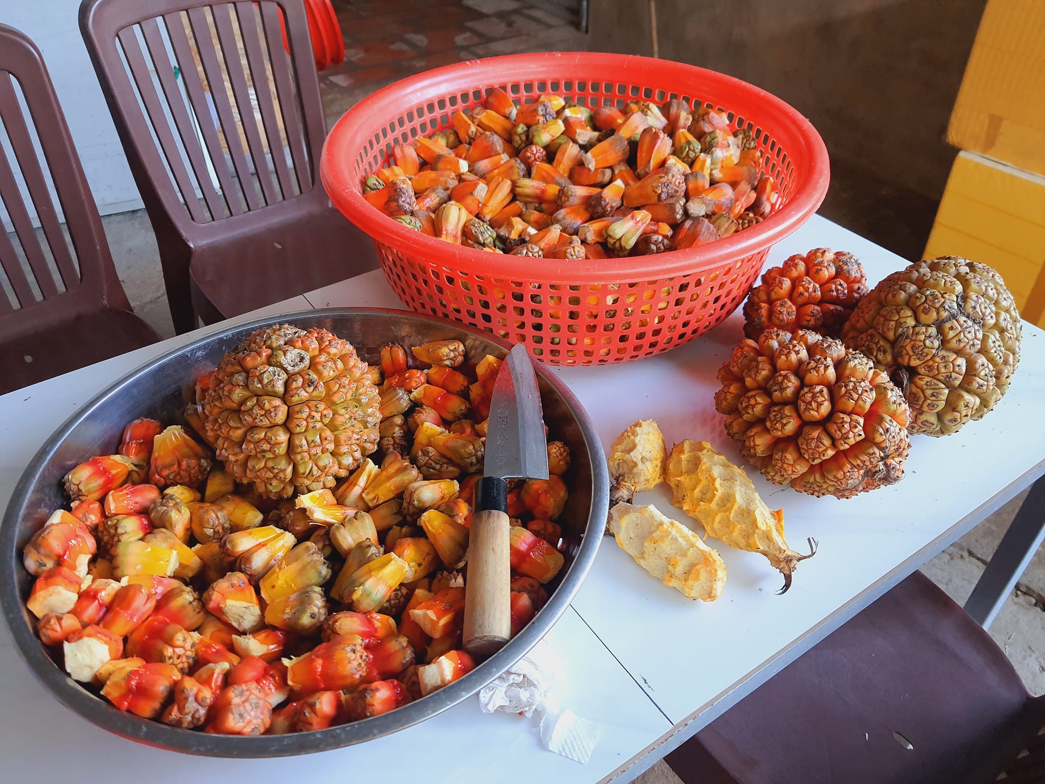 Trái dứa dại có nhiều hạt dạng múi cứng bám quanh một cái cùi. Sau khi hái về, người ta sẽ được đục cùi, tách ra từng múi chẻ đôi rồi mang phơi trên nền xi măng trước sân nhà. Một trái dứa tươi nặng khoảng 1,5-2 kg, khi phơi khô sẽ còn 5-7 lạng.