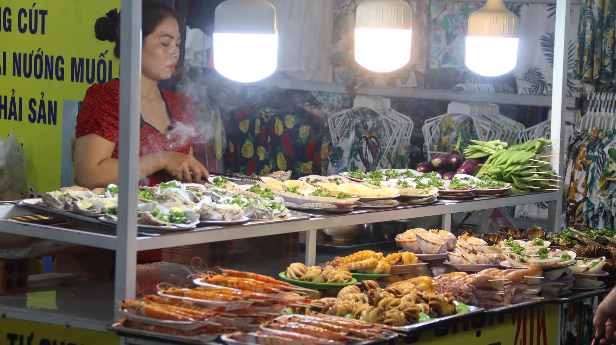 Không chỉ có hải sản, chợ đêm còn hấp dẫn du khách bởi những món ăn vặt đặc trưng như xôi nướng, đậu phộng rang, kẹo chỉ…, mang lại trải nghiệm vừa dân dã vừa thú vị.