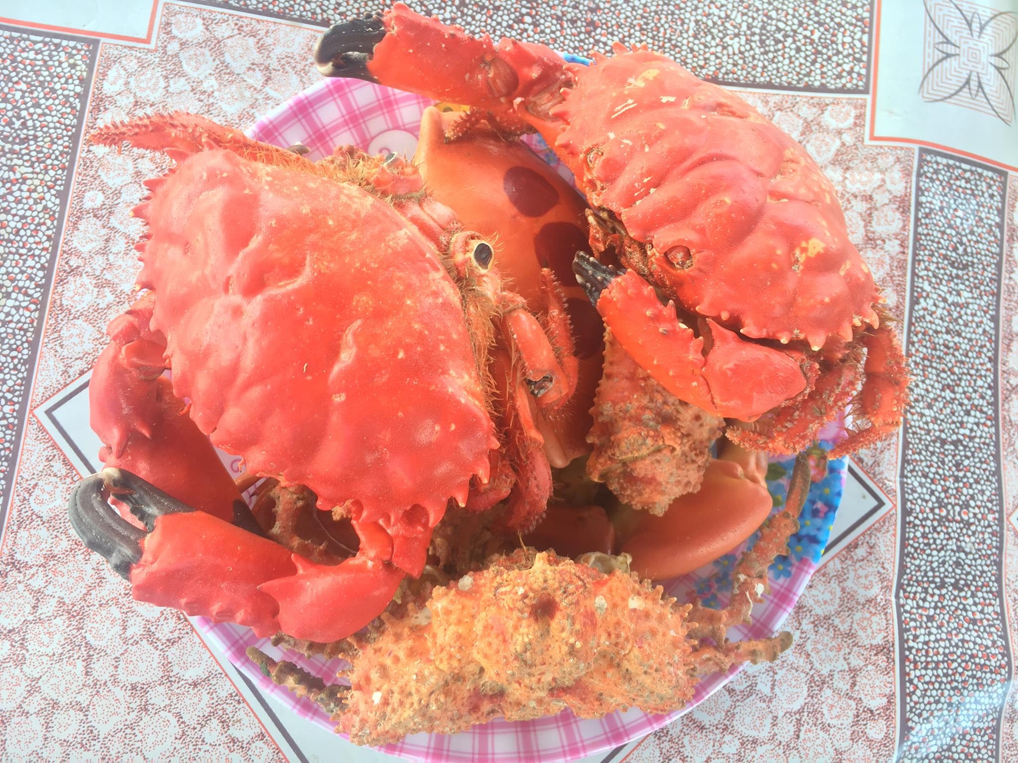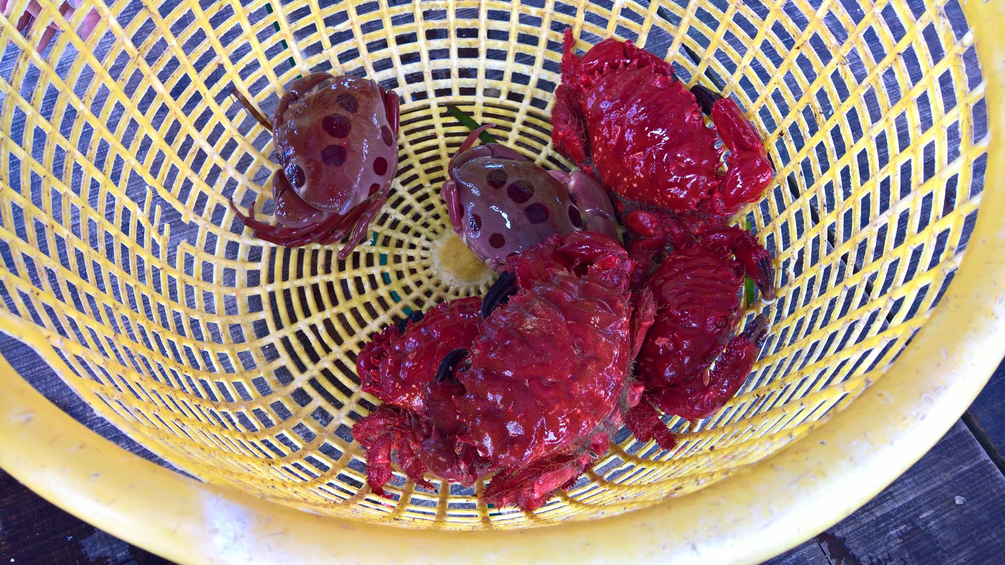 Cua đỏ là loại cua sống tự nhiên ở rạn san hô thuộc vùng biển Phú Quý, con to nhất có trọng lượng lên đến hơn 1kg. Cái tên nữ hoàng và hoàng hậu là do cách gọi mỹ miều của một số người dân địa phương đặt cho loại cua đỏ này.