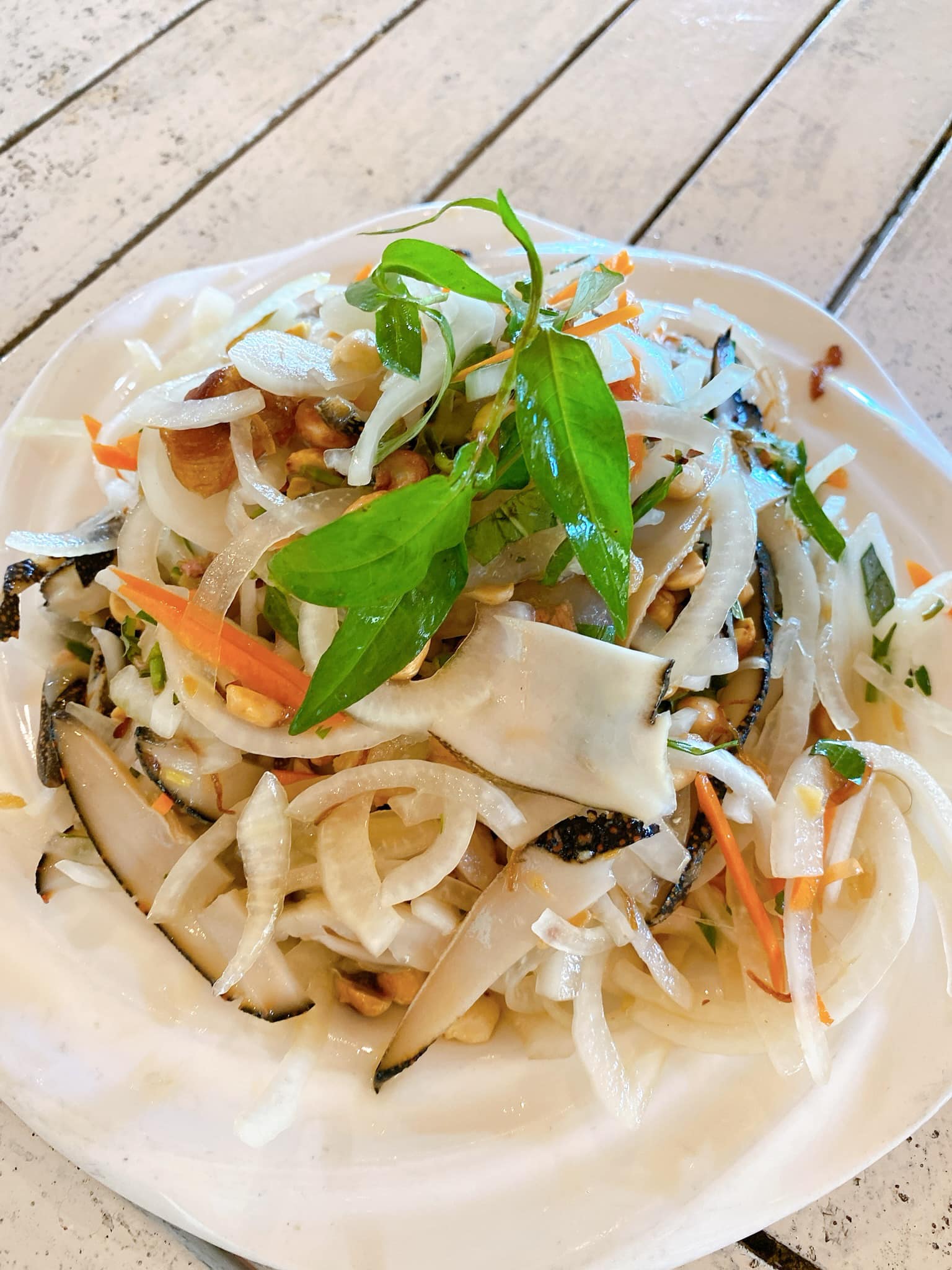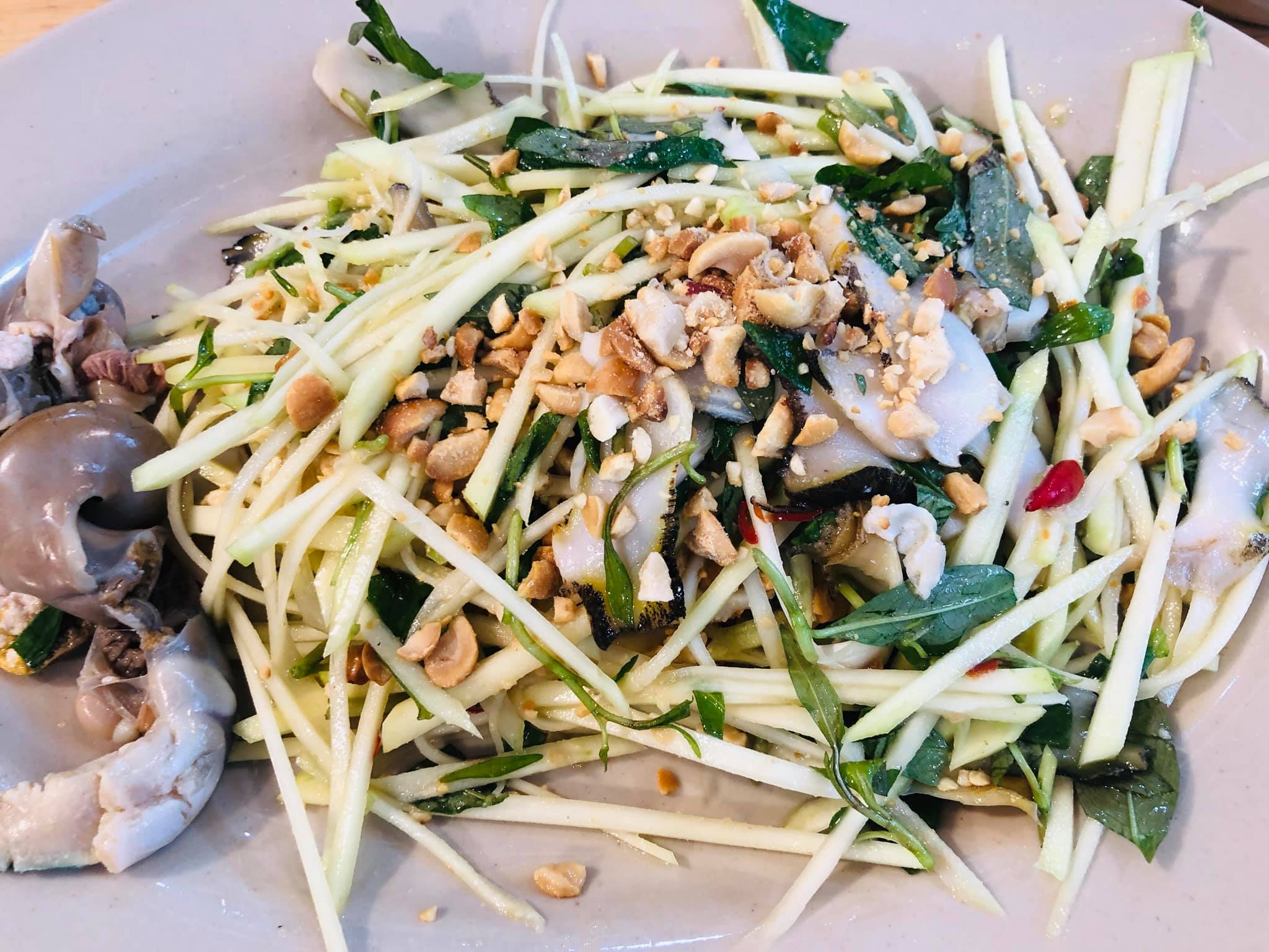Gỏi ốc Phú Quý cũng là một món ăn rất hấp dẫn tại đảo, được chế biến từ đa dạng các loại ốc tươi ngon như: Ốc Gai, Ốc Giác, Ốc nón (ốc đụn), Ốc bàn tay, Ốc vú nàng…và được ăn kèm với rau sống, bánh tráng nướng. Hương vị đậm đà cộng với mùi thơm của rau hòa quyện cùng vị cay của ớt, vị ngọt của ốc ăn mãi mà không thấy chán.