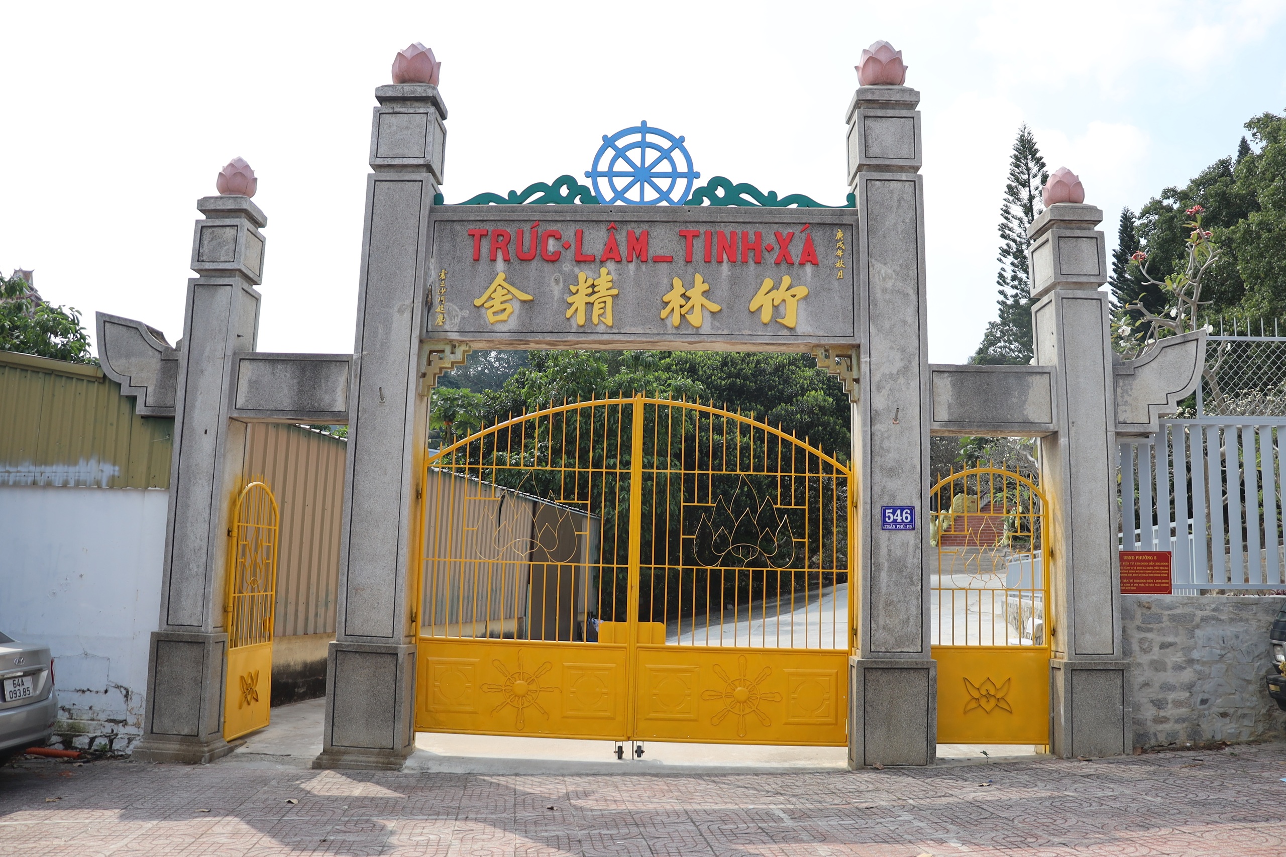 Ngay từ cổng Tam Quan bằng đá xám, Trúc Lâm Tịnh Xá đã tạo ấn tượng với bánh xe Pháp luân và những đóa sen hồng trang nghiêm. Bước vào bên trong, không gian mở ra khoáng đạt, xanh mát với lối đi rợp bóng cây sứ đại, cây ăn quả, mang lại cảm giác nhẹ nhõm và an yên.