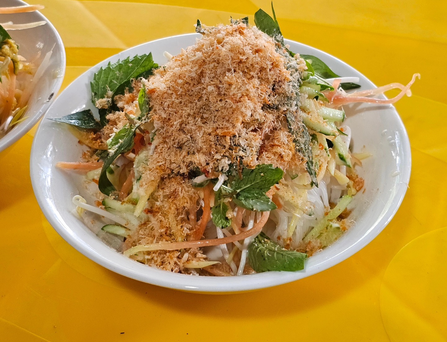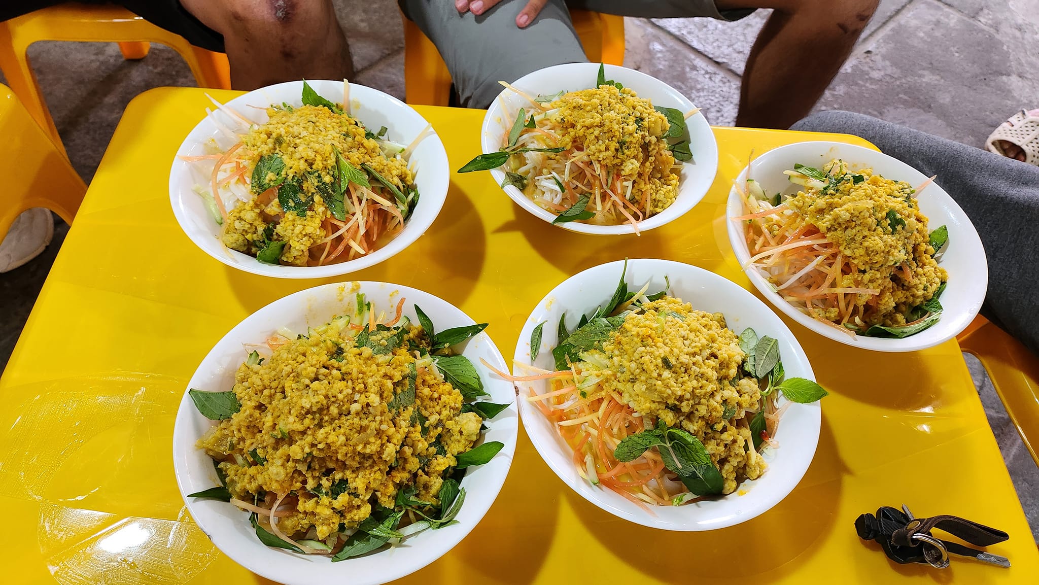 A bowl of Bún Kèn is vibrant and inviting: white noodles and bean sprouts, golden shredded papaya or banana blossom, green herbs and cucumbers, a hint of red chili, and golden-brown minced fish coated in coconut broth. When mixed together, the flavors blend harmoniously—the creaminess of coconut milk, the natural sweetness of sea fish, the gentle heat of chili, and the crunchy freshness of herbs and vegetables. The result is a balanced combination of sweet, spicy, savory, and fragrant notes. A proper bowl should feel rich yet refreshing, leaving a lingering taste that makes travelers remember Phu Quoc long after they leave.