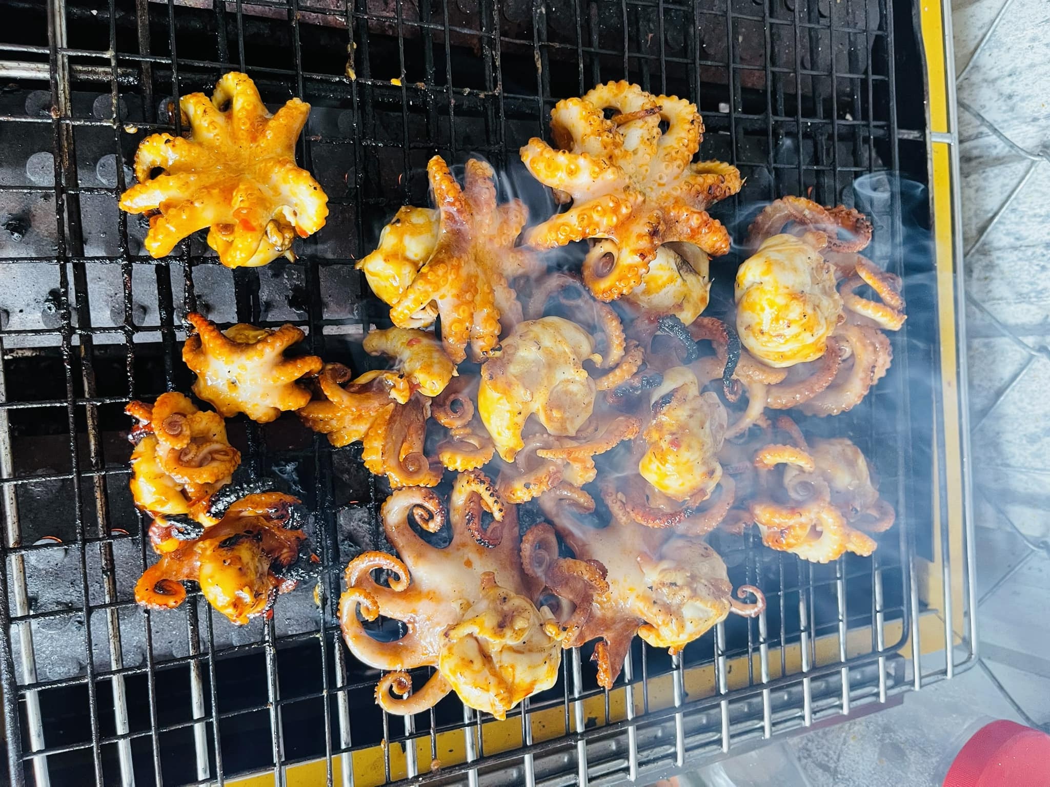 Grilled spicy octopus is one of the most irresistible seafood dishes on Lý Sơn Island. After being thoroughly cleaned, the octopus is marinated with satay, minced chili, seasoning powder, and pepper until fully infused with flavor. A thin layer of oil is brushed on before grilling over glowing charcoal, turning frequently to ensure even cooking.
