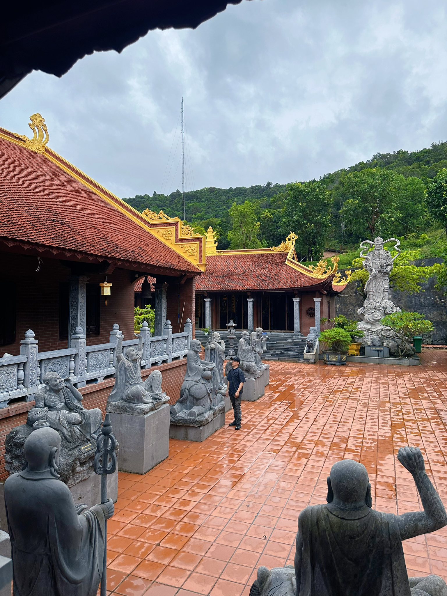 The main hall—Dai Hung Bao Dien—is designed in the traditional five-bay, two-wing style of ancient northern temples and constructed entirely from precious ironwood. At the center sits a gold-plated statue of Shakyamuni Buddha, flanked by Manjushri Bodhisattva on a lion to the right and Samantabhadra Bodhisattva on an elephant to the left. The pagoda also houses a stupa containing Buddha relics, a shrine to Mother Au Co where Dong Son bronze drums and ancient cultural engravings are preserved, and the ancestral hall dedicated to the three founders of the Truc Lam Zen Sect: Tran Nhan Tong, Phap Loa and Huyen Quang. Meditation halls, lecture halls, a One-Pillar Pagoda replica, a Guanyin Courtyard and a worship area for Ksitigarbha Bodhisattva extend further around the grounds.