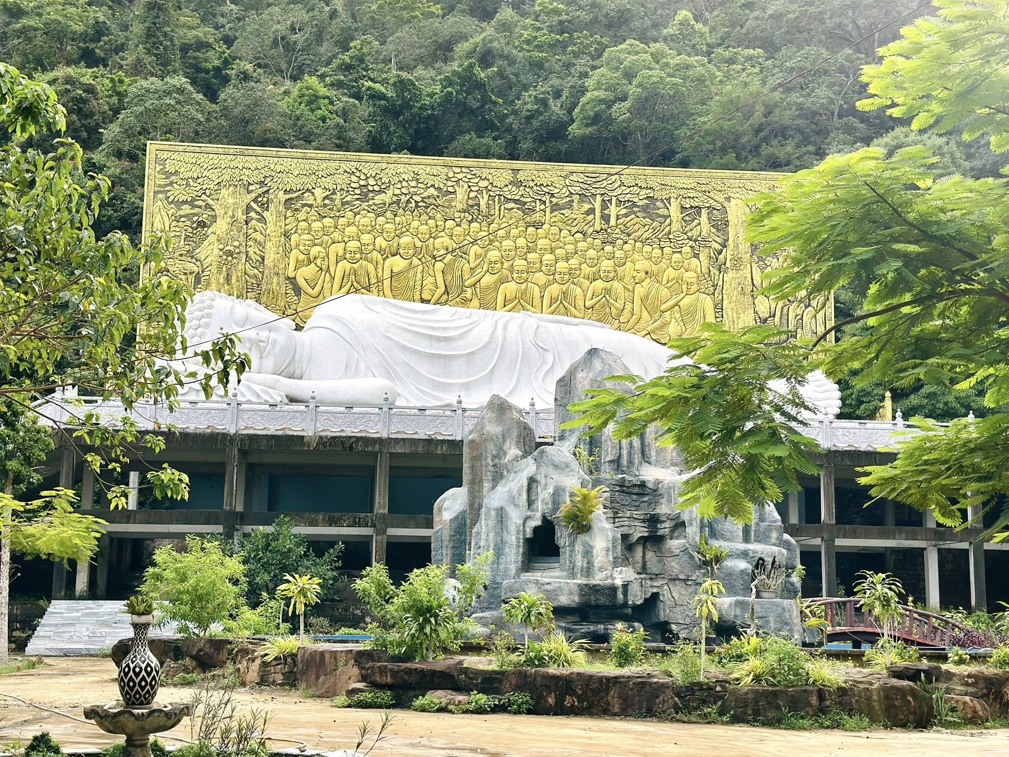 Climbing higher up the hill leads to one of the temple’s most striking features: the Reclining Buddha statue, about 3.5 meters long and symbolizing the Buddha’s final enlightenment. Flanked by two jade-green dragon statues, this area combines dynamic and serene elements in perfect harmony.