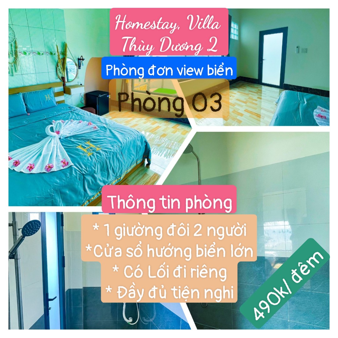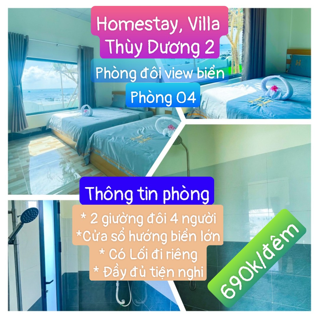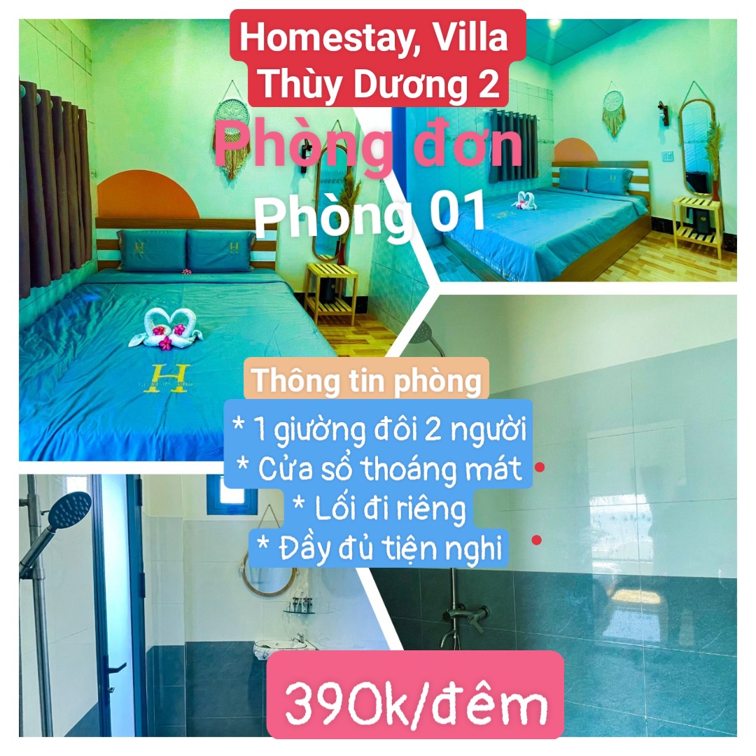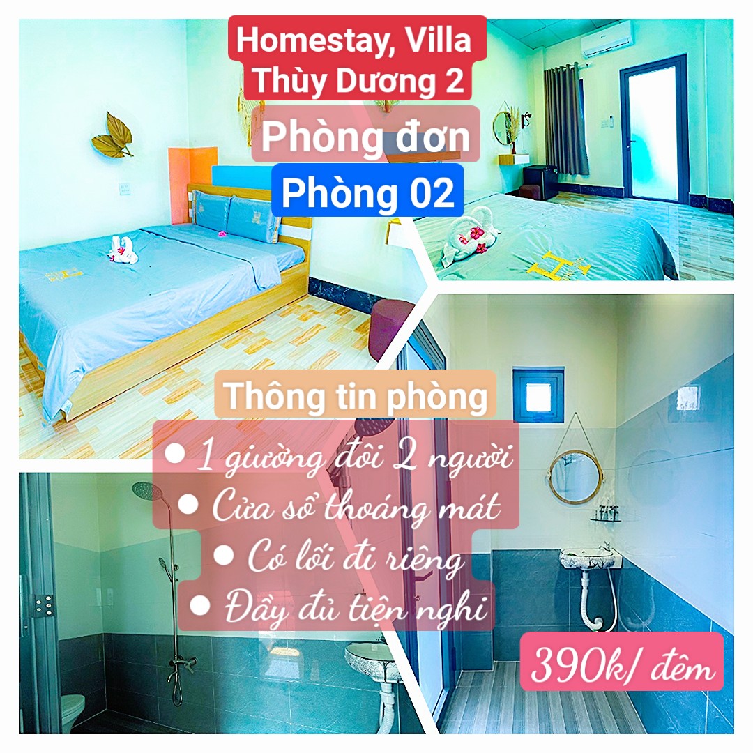 Giá cho thuê nguyên ngày cả căn Villa Homestay Thùy Dương là: 1.800.000 VNĐ/ngày phù hợp cho nhóm từ 6 – 10 người, có ghế, đệm gấp phục vụ cho việc ngắm cảnh, wifi, cửa sổ, rèm cửa, dụng cụ bếp,máy giặc, tủ lạnh, nhà tắm đầy đủ, dụng cụ BBQ