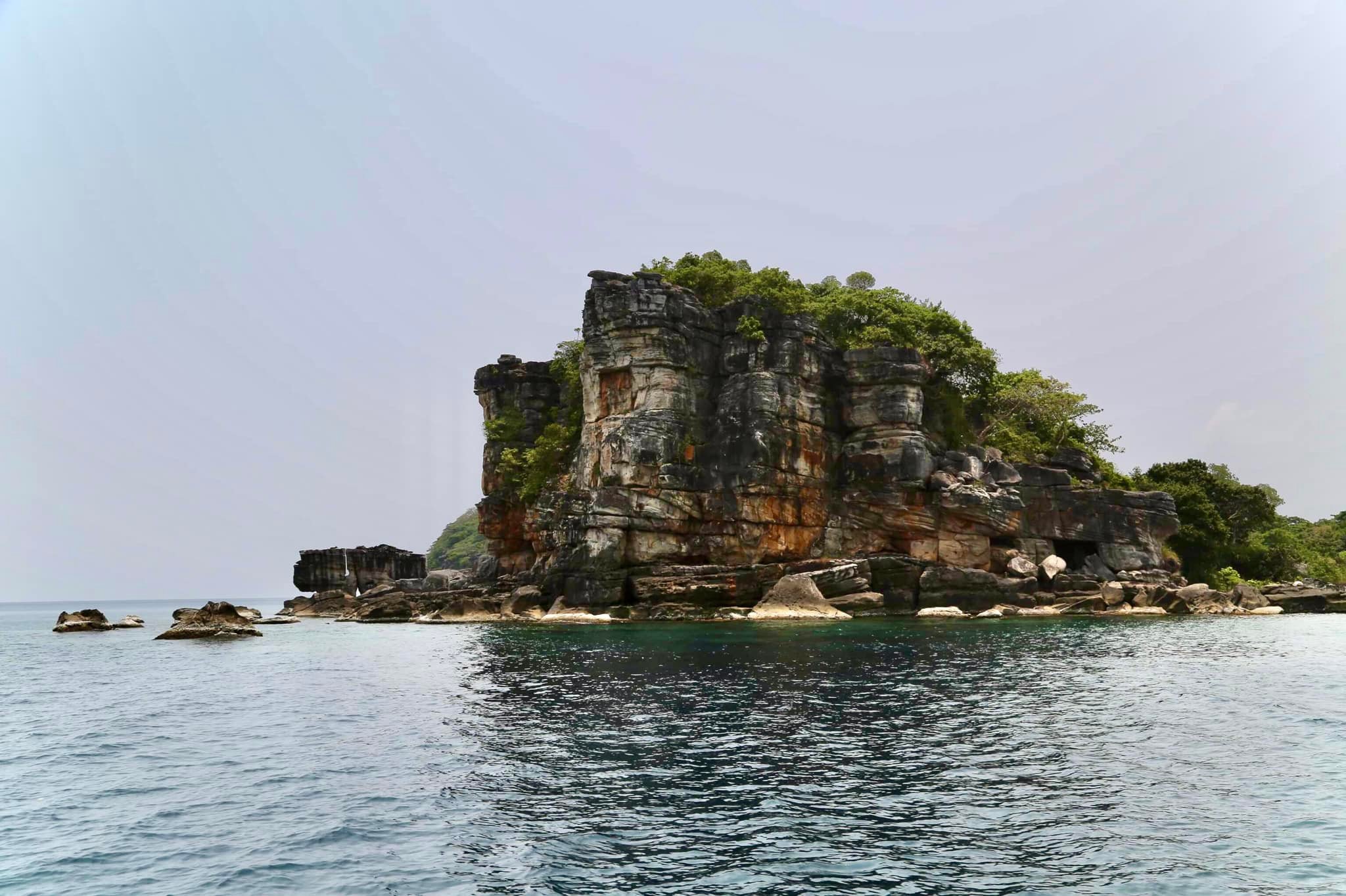 Bao quanh đảo là làn nước biển trong xanh màu ngọc bích, tĩnh lặng và phản chiếu rõ hình dáng các khối đá ven bờ. Một số khu vực xuất hiện bãi cát trắng mịn, kéo dài sát mép nước, thích hợp để dừng thuyền, ngắm cảnh và cảm nhận không gian biển đảo yên bình.