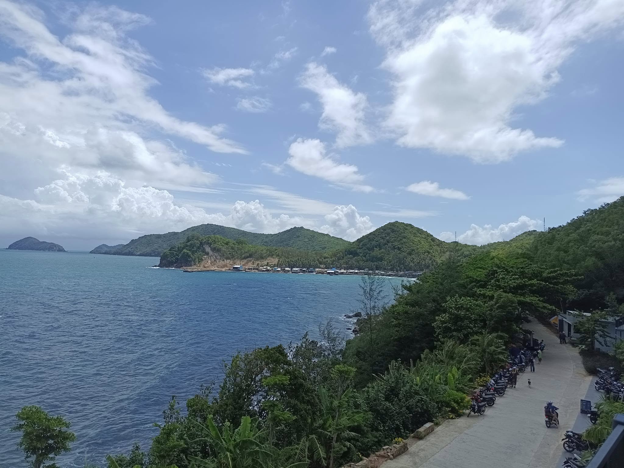 Du khách đến Hòn Lớn thường thuê xe máy chạy dọc con đường ven đảo, một bên là vách núi đá, một bên là biển xanh ngọc bích – cung đường được xem là đẹp nhất Nam Du.