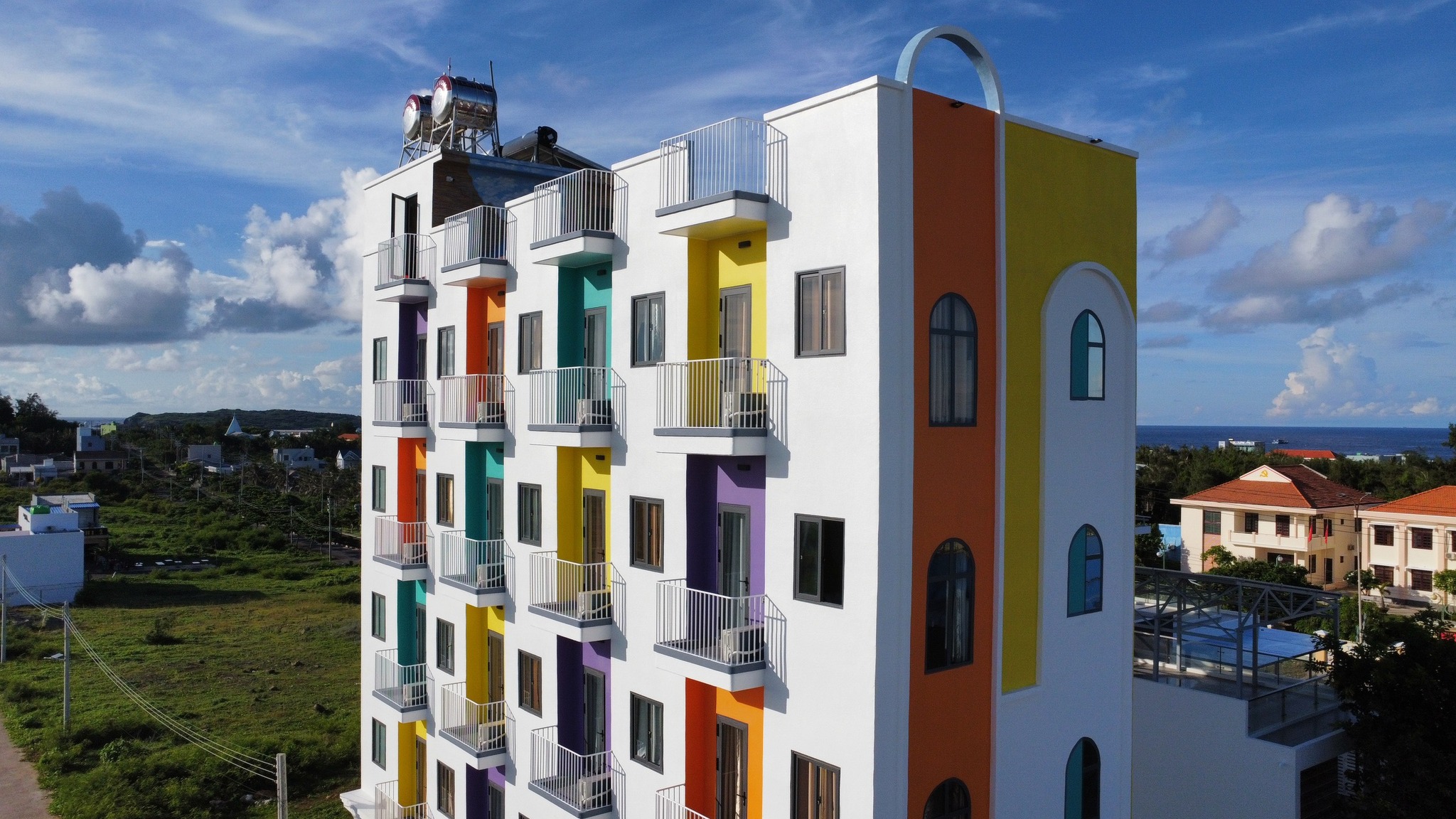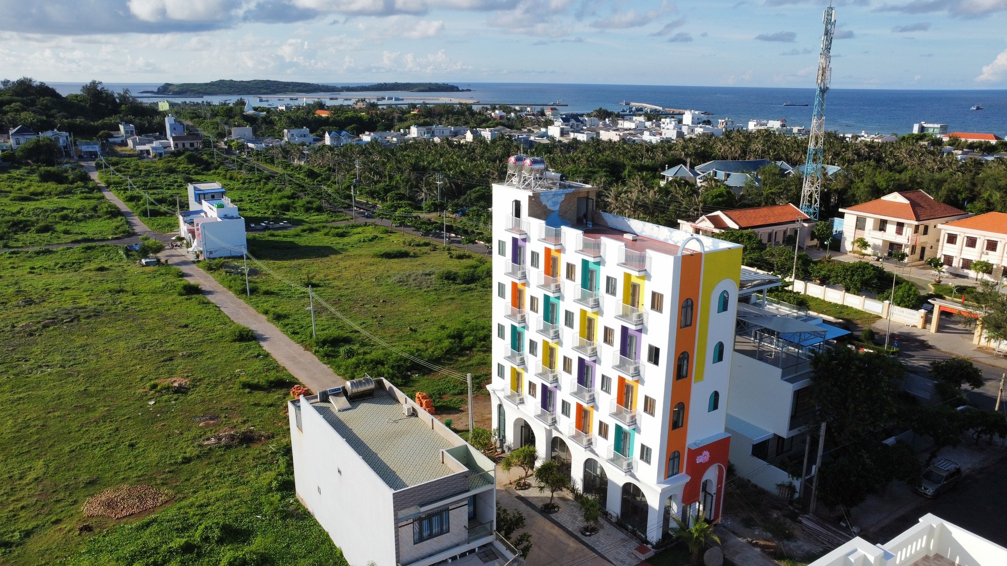Tọa lạc tại vị trí trung tâm đảo Phú Quý, khách sạn Nắng gây ấn tượng bởi những căn phòng được thiết kế, trang trí bằng các gam màu rực rỡ, đan xen đầy ấn tượng. Đêm đến, những ô cửa lên đèn lung linh nhiều màu sắc.