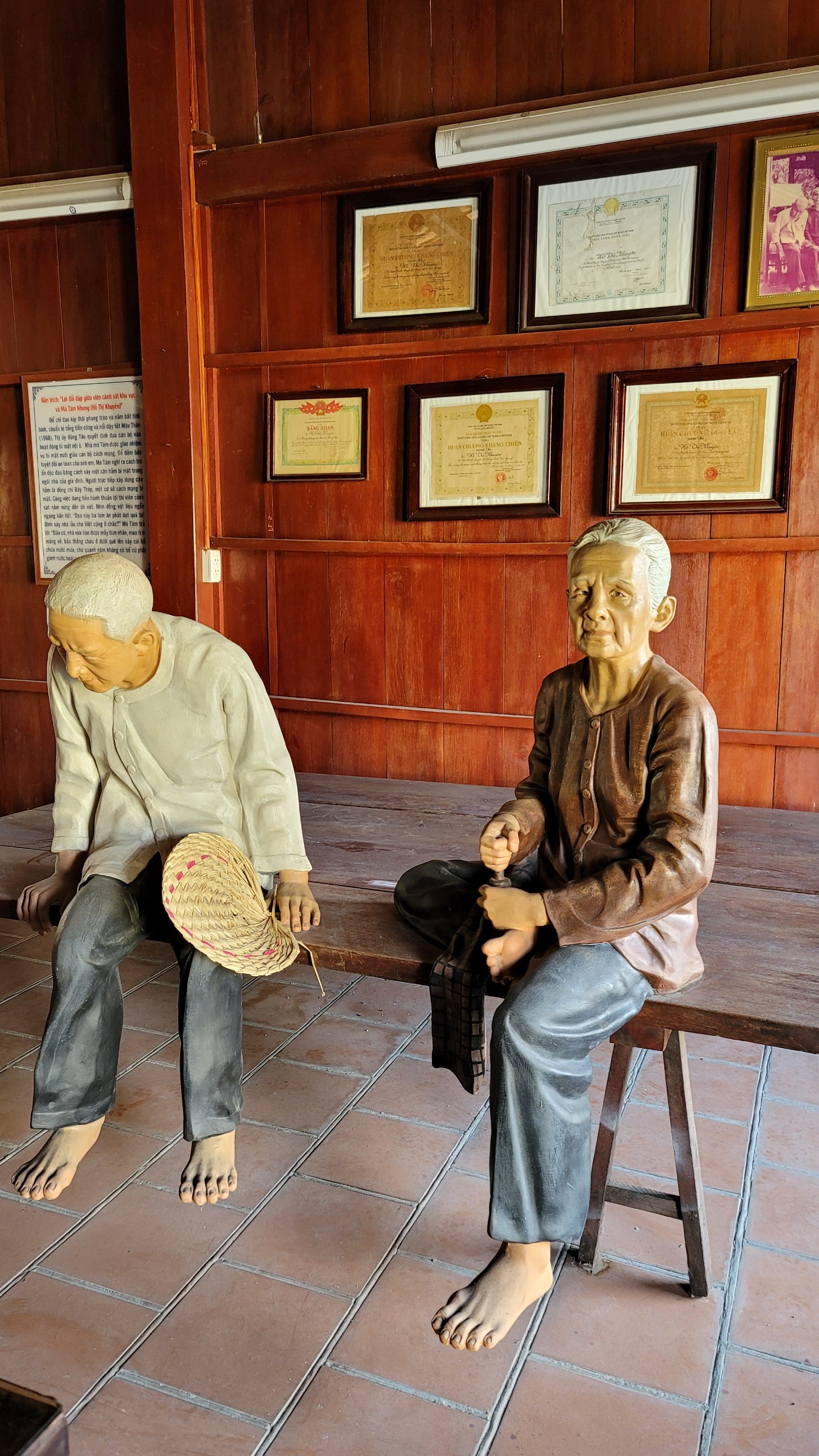 Trong ngôi nhà còn trưng bày một nhóm tượng ma nơ canh gồm hai tên cảnh sát Việt Nam Cộng Hoà trong trang phục quần trắng, áo trắng, đội mũ Kêpi trắng, một tên hung hãn vừa khám xét vừa tra hỏi và một tên khác đang ngó nghiêng lục soát phía nhà dưới. Tương phản với sự hung hãn táo tợn của kẻ thù, ông bà Tám Nhung ngồi yên lặng với thái độ ung dung, điềm tĩnh. Má Tám trong trang phục quần đen, áo bà ba nâu, mái tóc búi cao… hai tay ngoáy trầu nhưng đôi mắt ánh lên đầy tự tin sẵn sàng đối đáp để ghìm chân kẻ thù.