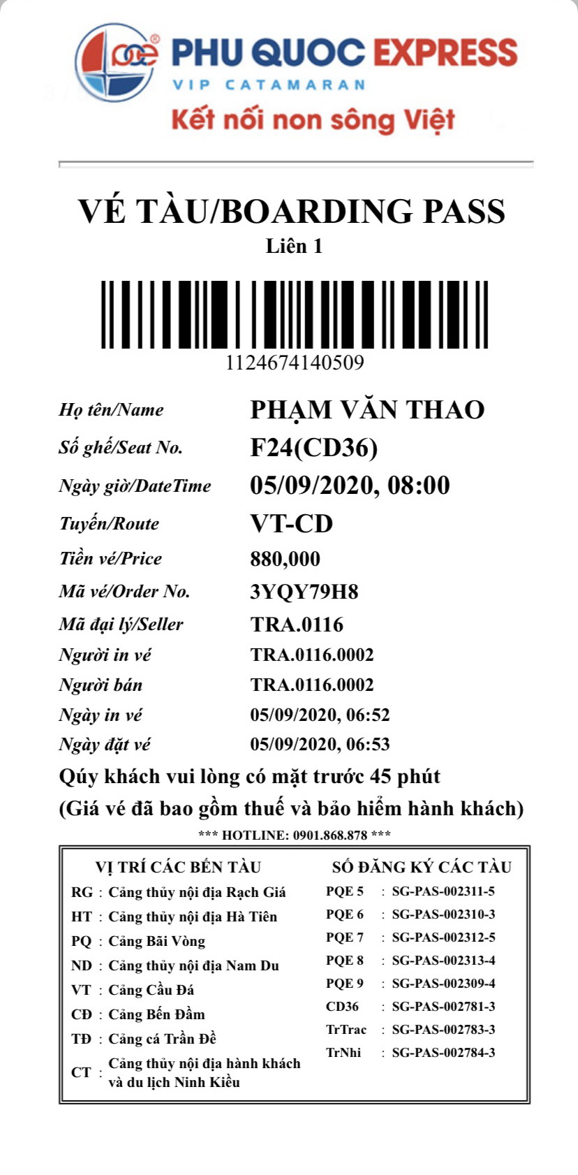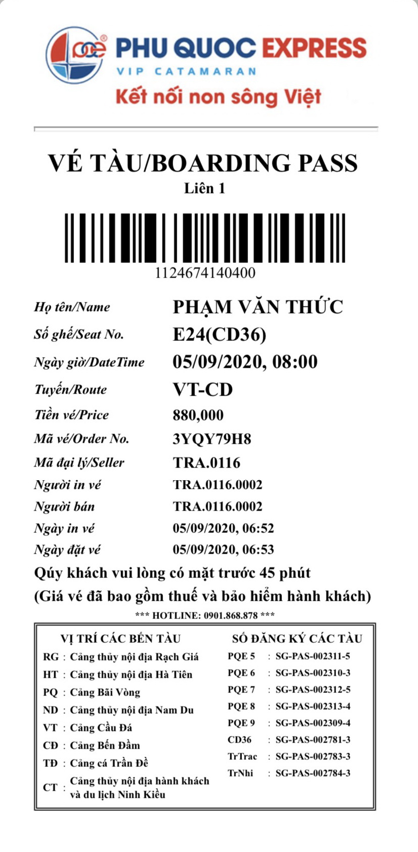 Bước 3: Sau khi quý khách hàng thanh toán sẽ chuyển vé điện tử thông qua Zalo/Email hoặc theo phương thức liên hệ của quý khách trước đó. Tham khảo mẫu vé điện tử khách hàng sẽ nhận được để cầm lên tàu.