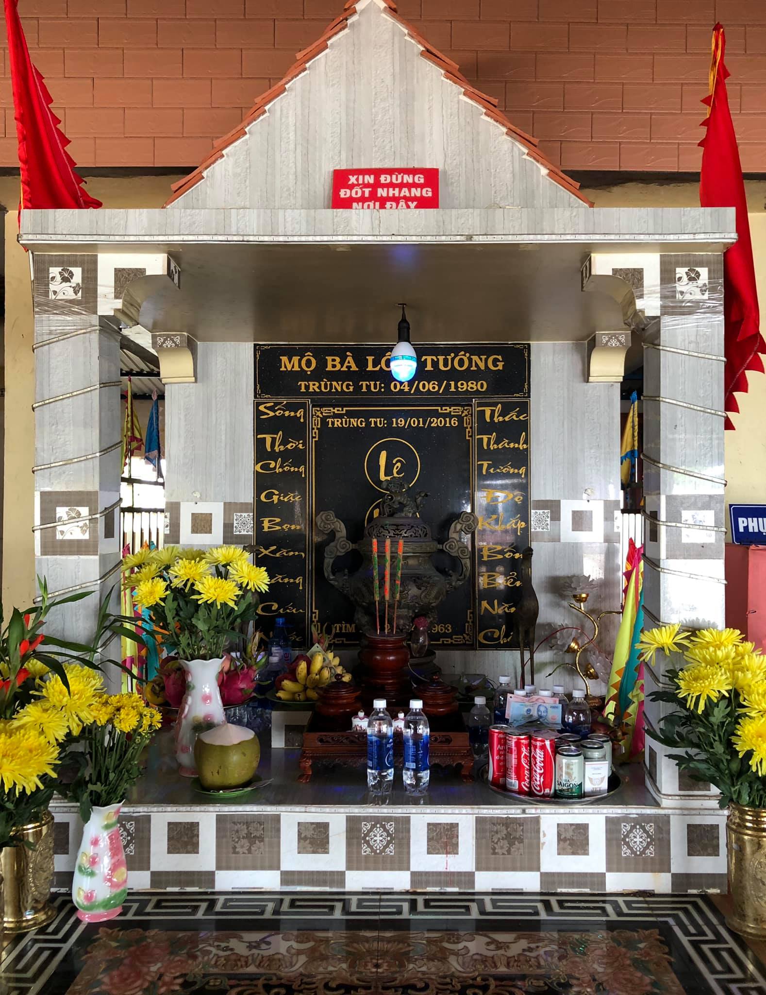 “…Ông Nguyễn Văn Đá (bá hộ Đá) lo chôn cất bà. Mộ đắp đất, bao quanh bởi bốn miếng ván bằng gỗ trai và bốn cột trai. Năm 1968, mộ được quyên tiền xây lại bằng đá.”