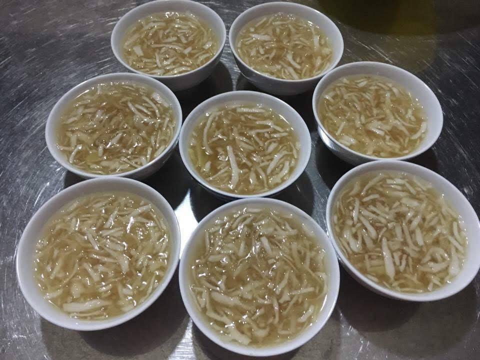 - Nếu là Rau câu khô thì trước tiên ngâm với nước lã đến khi nào nở ra vừa phải (dùng tay bấm sợi rong thấy mềm mềm là được, không nên để quá dai hay quá mềm, chè sẽ không ngon).