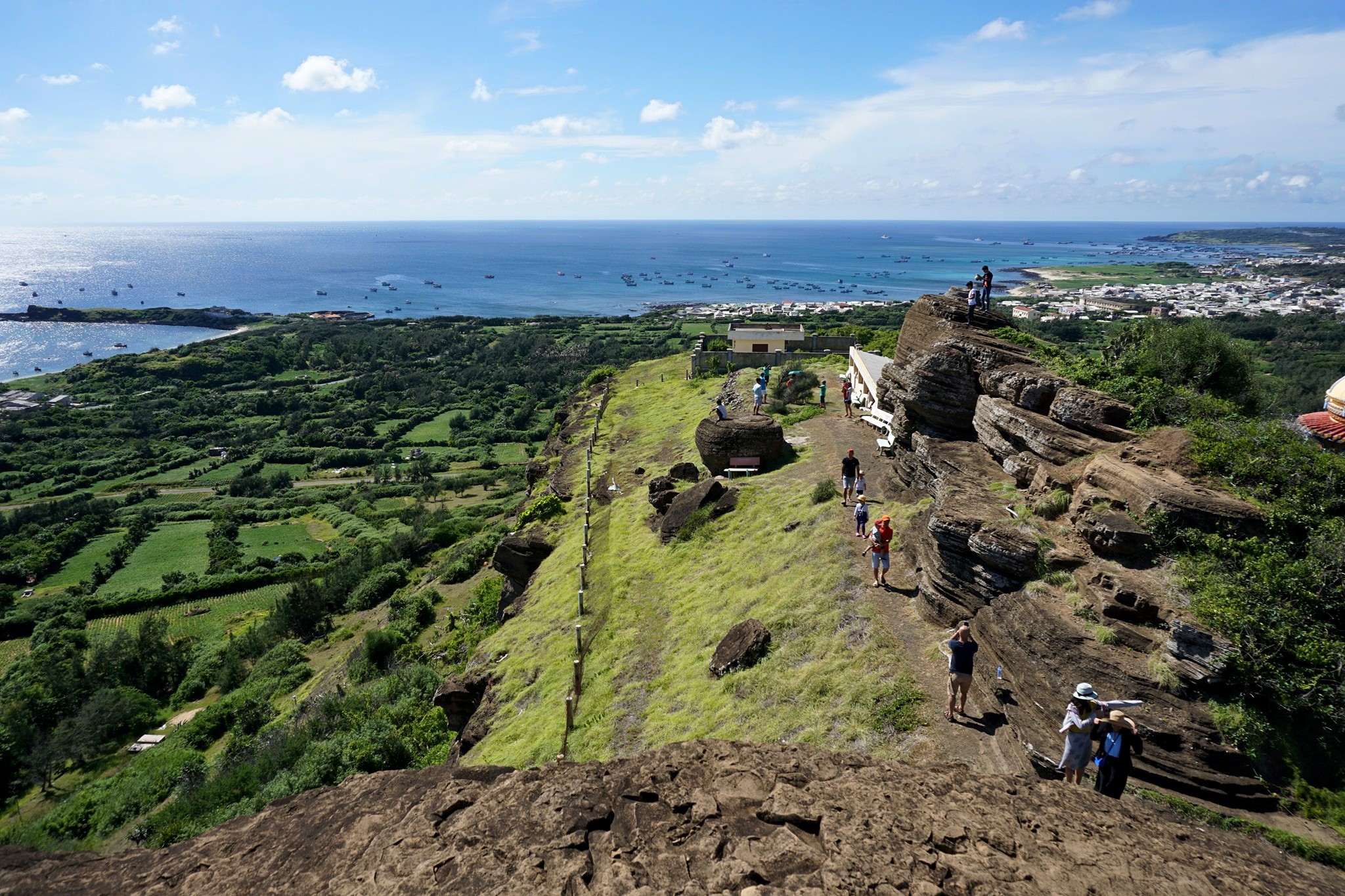 Từ trên đỉnh núi nhìn ra xa là những doi cát trắng trải dài dọc theo bờ biển bên làn nước màu xanh ngọc bích, du khách có thể phóng tầm mắt quan sát ra xa suốt cả một không gian rộng lớn của đảo và cảnh sinh hoạt đánh bắt cá, các loại ghe thuyền của ngư dân trên biển. Giữa khung trời, khung cảnh bình yên đẹp tuyền vời như thế, du khách sẽ tìm về cảm giác an nhiên, quên đi moi ưu phiền, lo âu sau những ngày lao động, mưu sinh.