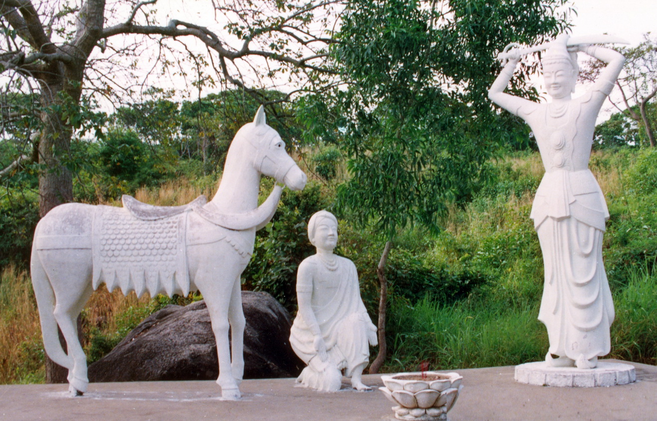 - Cảnh Xuất Gia: tượng Thái tử Tất Đạt Đa cắt tóc, người hầu Channa và Bạch Mã.