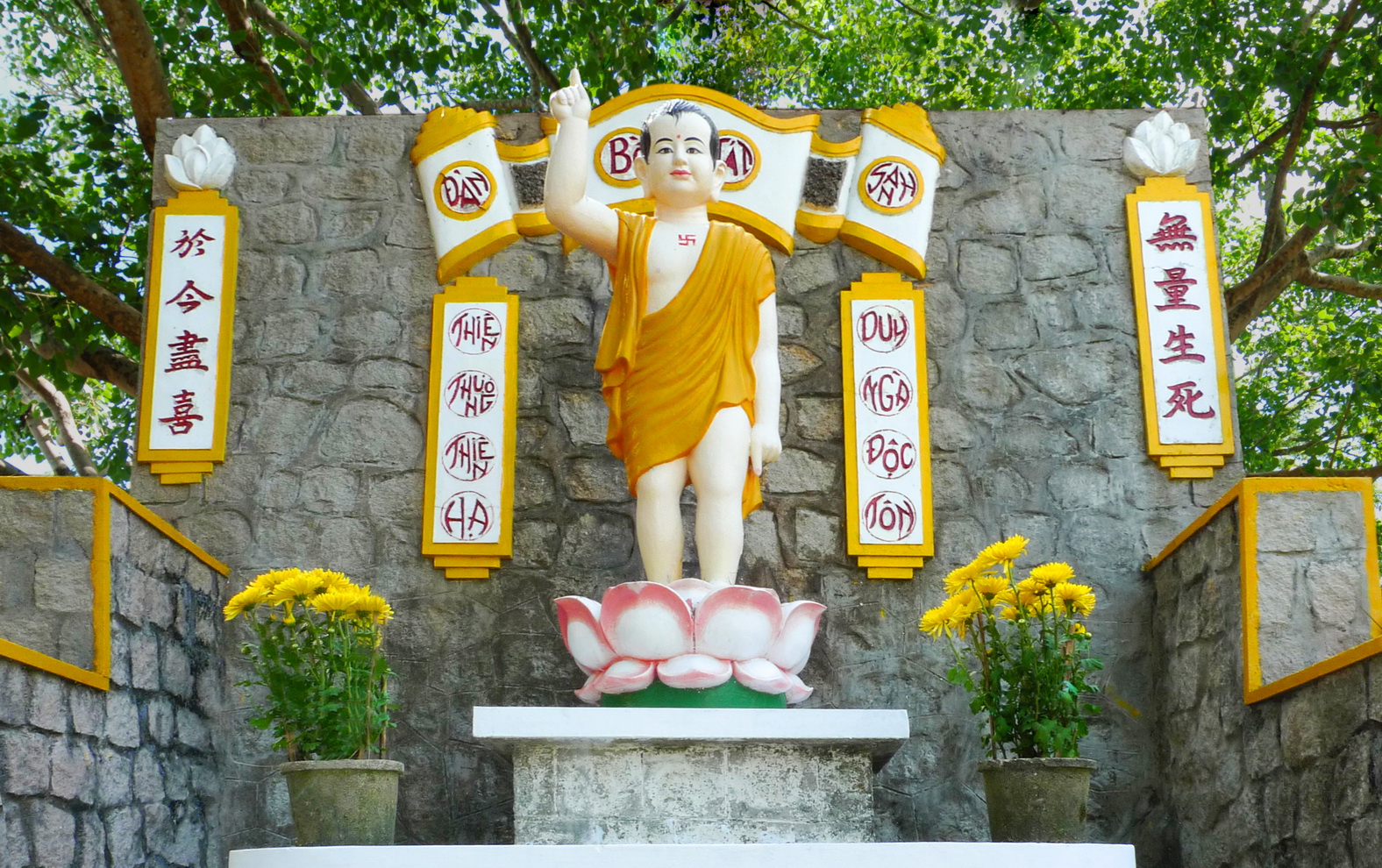 - Tượng Phật Đản Sanh: hài nhi đứng trên đài sen, tay chỉ trời – tay chỉ đất.