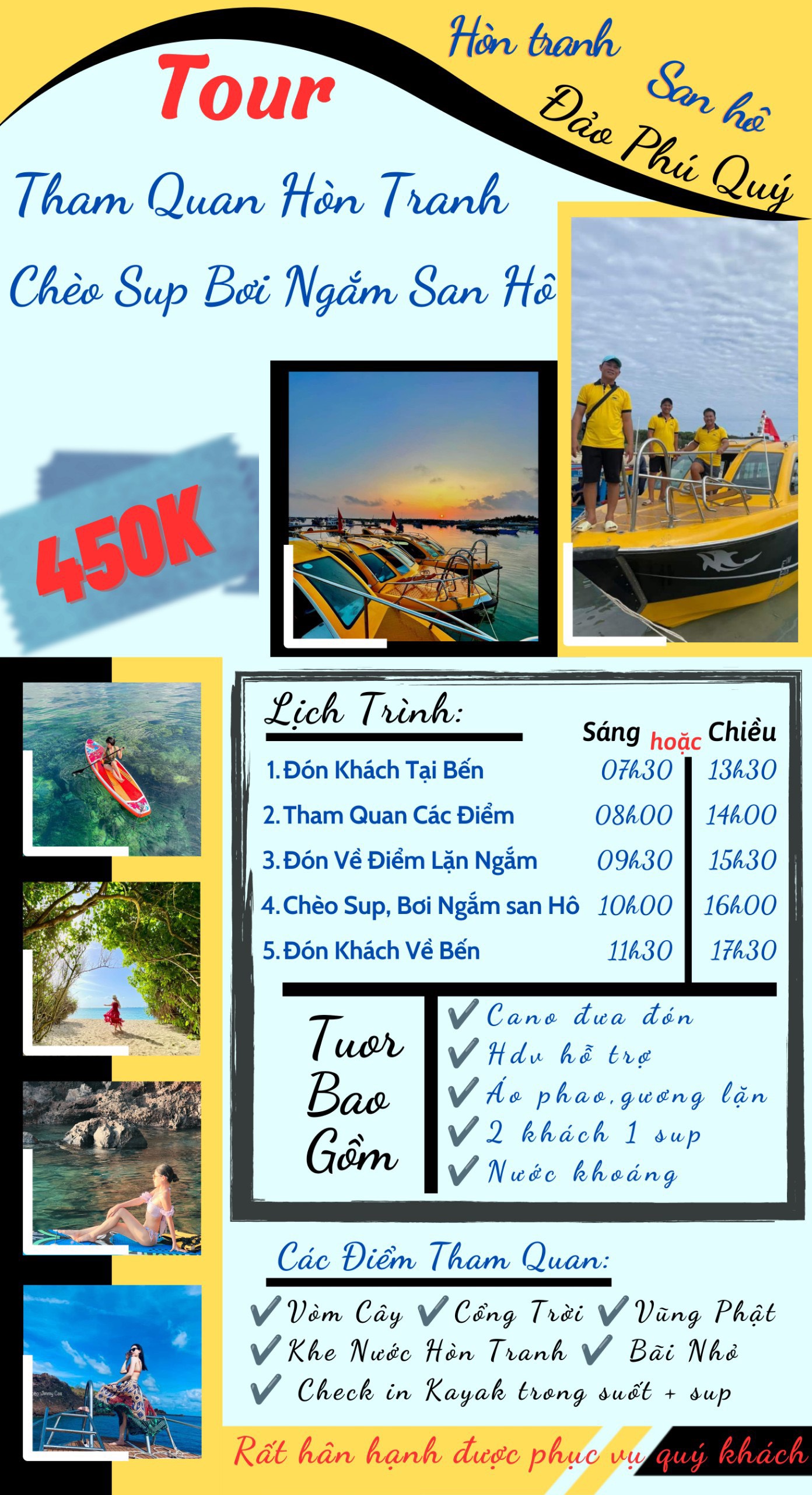 | 450.000 đồng/khách | – Tham quan Hòn Tranh – Chèo SUP – Bơi ngắm san hô |