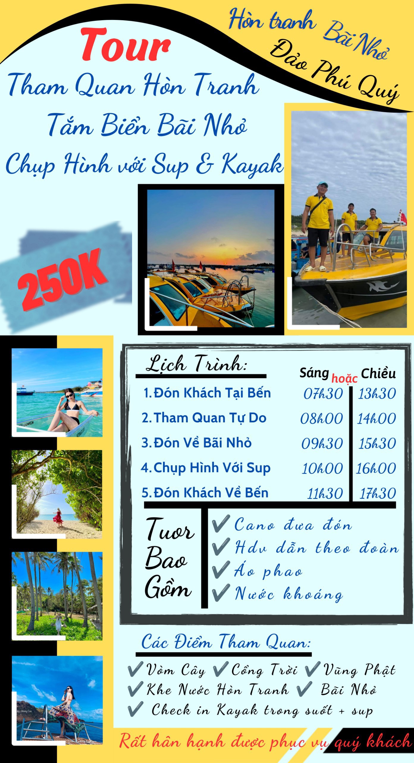 | 250.000 đồng/khách | – Tham quan Hòn Tranh – Tắm biển Bãi Nhỏ – Chụp hình với SUP & Kayak |