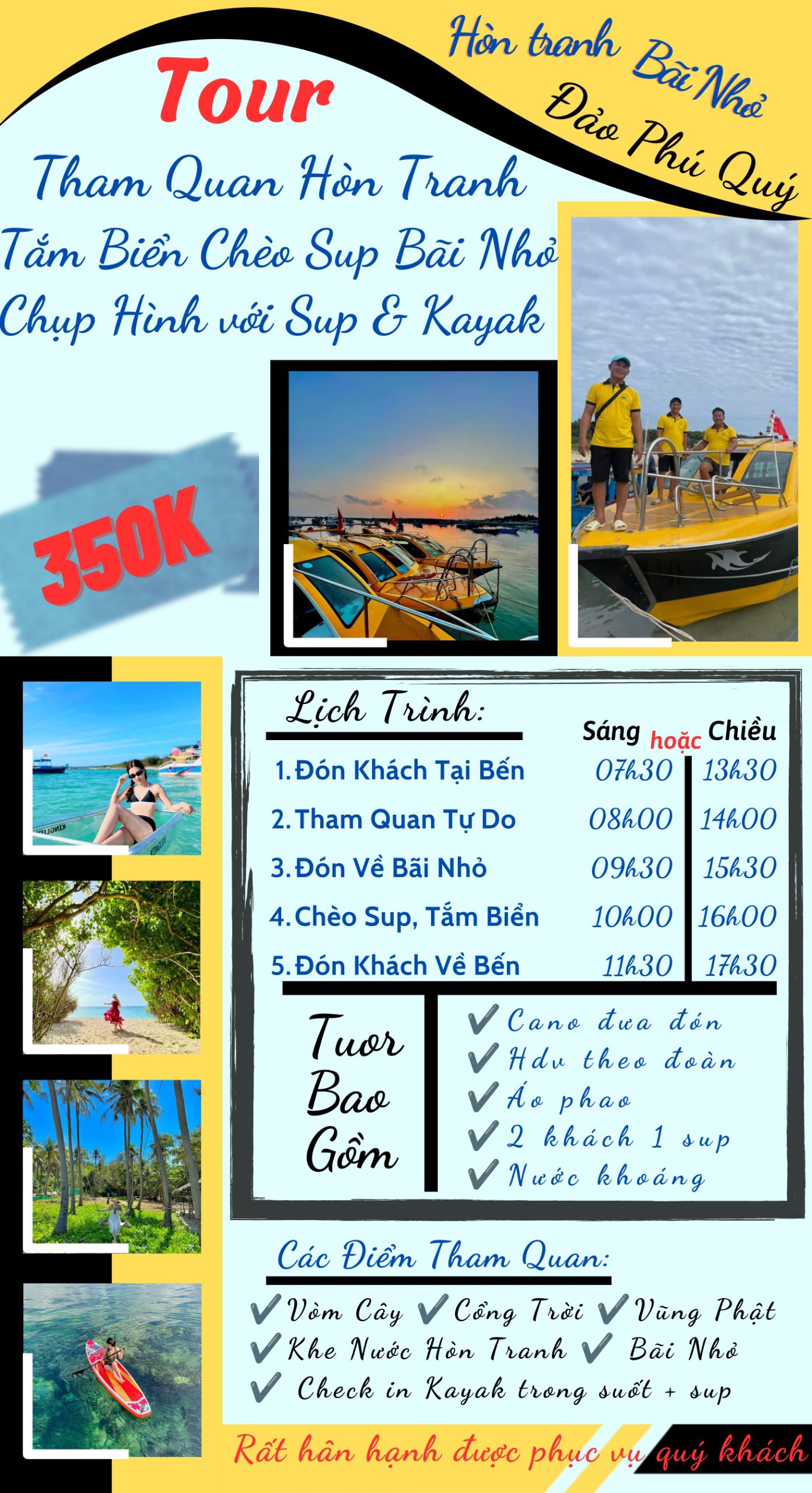 | 350.000 đồng/khách | – Tham quan Hòn Tranh – Tắm biển – Chèo SUP Bãi Nhỏ – Chụp hình với SUP & Kayak |
