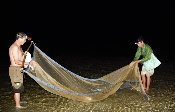 Chú Tuấn và người bạn đồng hành đã chờ sẵn. Sau màn chào hỏi, chú Tuấn hướng dẫn chúng tôi đeo đèn pin lên đầu rồi tiến ra biển. Theo lời chú Tuấn, đầu tháng và ngày rằm, nước biển rút sâu từ chập tối đến đêm cũng là thời điểm chú và nhiều người dân thường tranh thủ ra biển lưới tép, bắt sò ốc. “Vịnh Côn Sơn bãi phẳng chủ yếu lưới tép. Nếu muốn bắt ghẹ, cua, sò ốc thì tìm đến các bãi đá khu vực Cỏ Ống, Đầm Trầu vì các loại hải sản này ẩn nấp dưới đá, sỏi, san hô”, chú Tuấn cho hay.